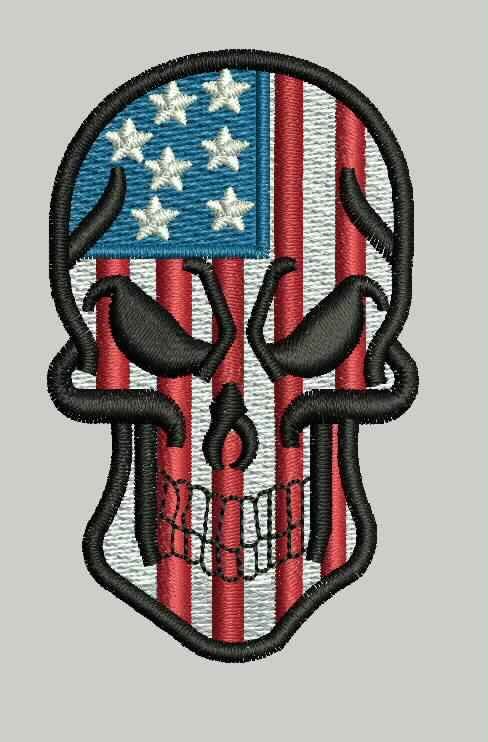 Skull embroidery with integrated American flag design.