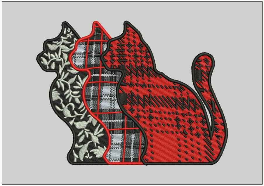 This whimsical embroidery design showcases three seated cat silhouettes, each with a unique textile-inspired pattern. The left cat features a black and white floral motif, the center cat displays a plaid pattern with red accents, and the right cat boasts a bold red and black hounds tooth. Perfect for pet lovers and textile enthusiasts, this design adds charm to any fabric project.
