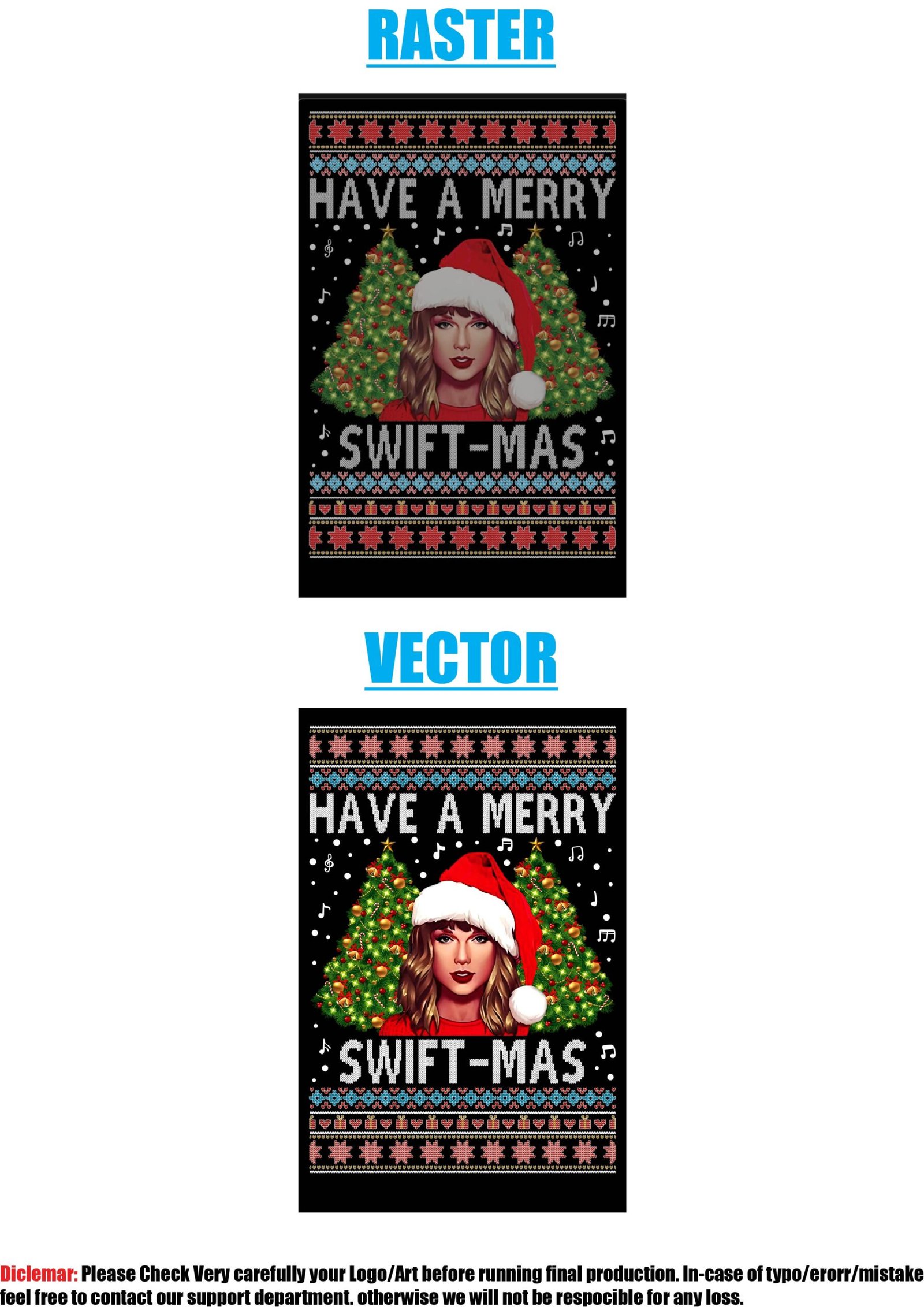 This comparison highlights the difference in clarity between raster and vector formats using a “Swiftmas” holiday design. Musical notes, sweater patterns, and festive elements appear sharper in the vector version. Ideal for guiding clients on artwork submission standards.