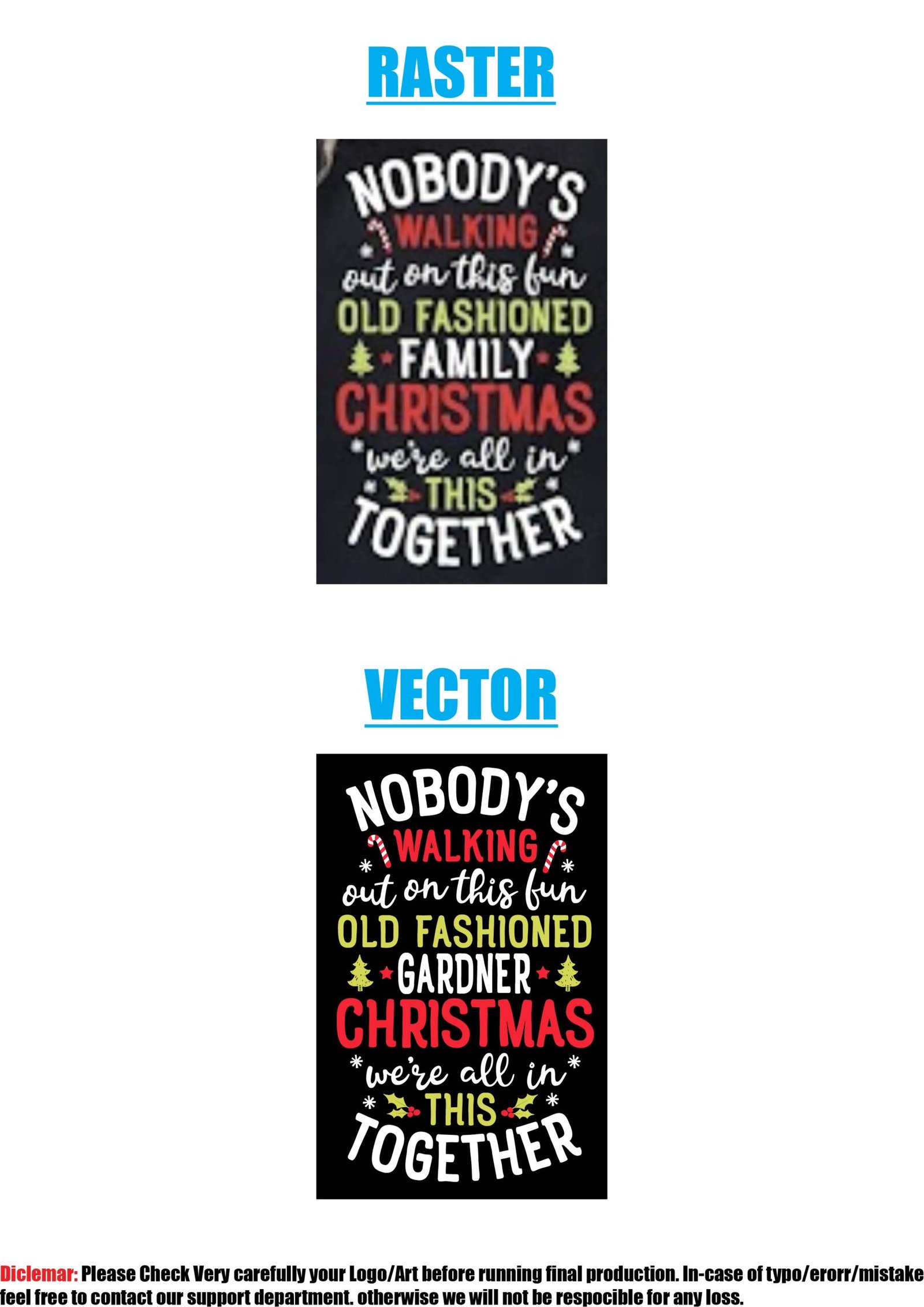 This festive graphic compares raster and vector versions of a holiday quote design. Decorative elements like candy canes, trees, and snowflakes highlight the clarity difference. The raster version is blurry, while the vector version is sharp—perfect for demonstrating why vector files are preferred for production.