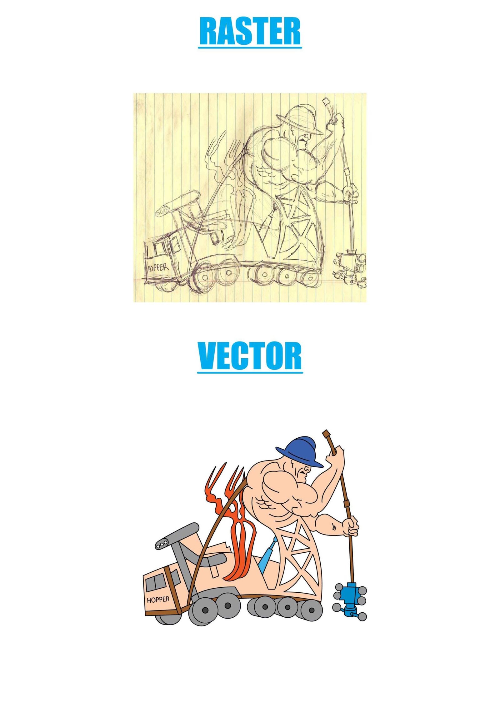 Muscular figure integrated into a machine labeled “HOPPER” with flames and tools.