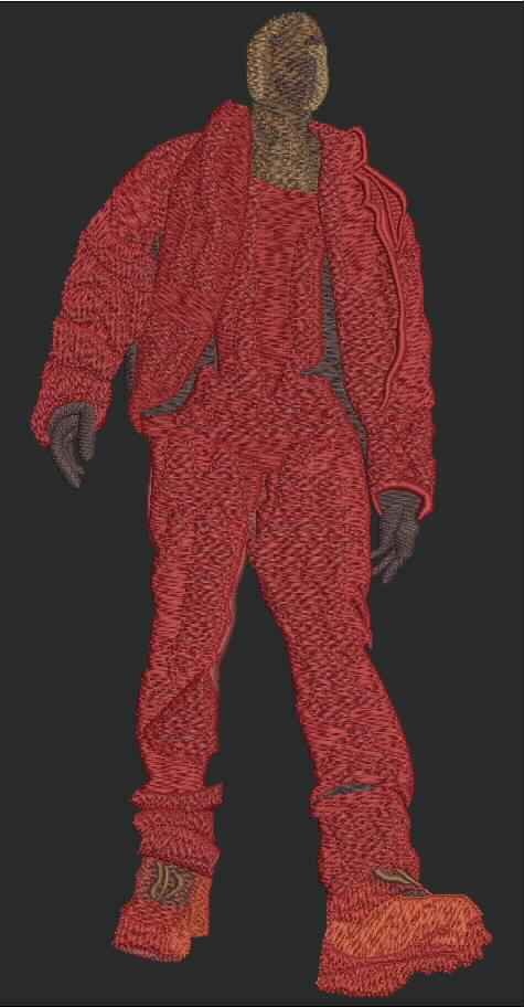 This bold design features a person in a red outfit with large footwear, rendered in a wavy, thread-like texture. The contrast between clothing and skin tones adds visual interest. Ideal for fashion-forward patches, streetwear, or abstract textile art.
